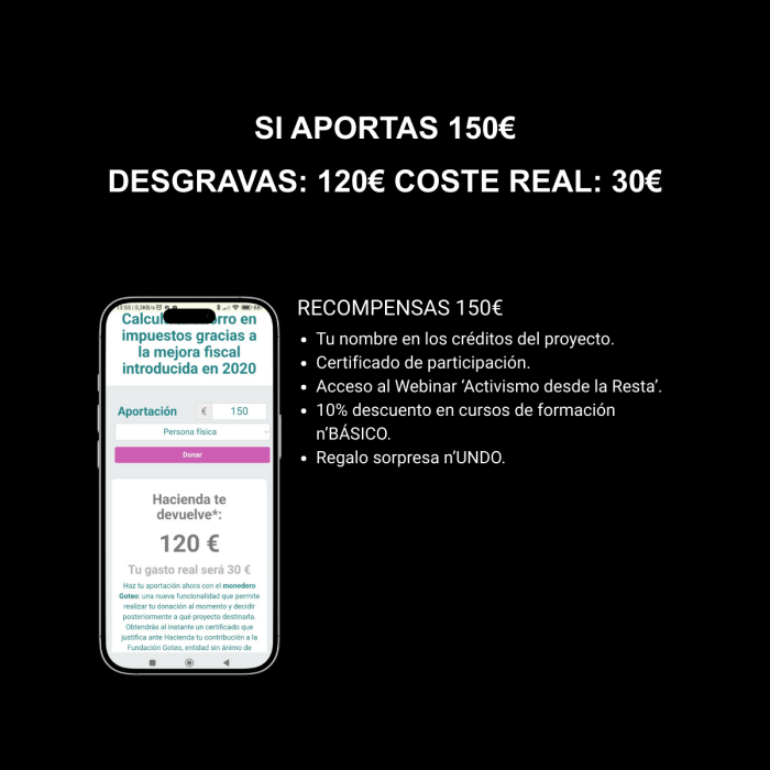 Si quieres donar una cantidad mayor o diferente, o si eres una empresa (que tiene un 40% de deducción en el Impuesto de Sociedades), Goteo pone a tu disposición una herramienta transparente para que sepas exactamente cuánto te costará apoyar el Bien Común.